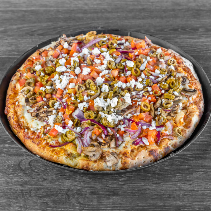 Cheese, Pesto & Red Sauces, Chicken Breast, Onions, Mushrooms, Tomatoes, Green Olives & Feta Cheese